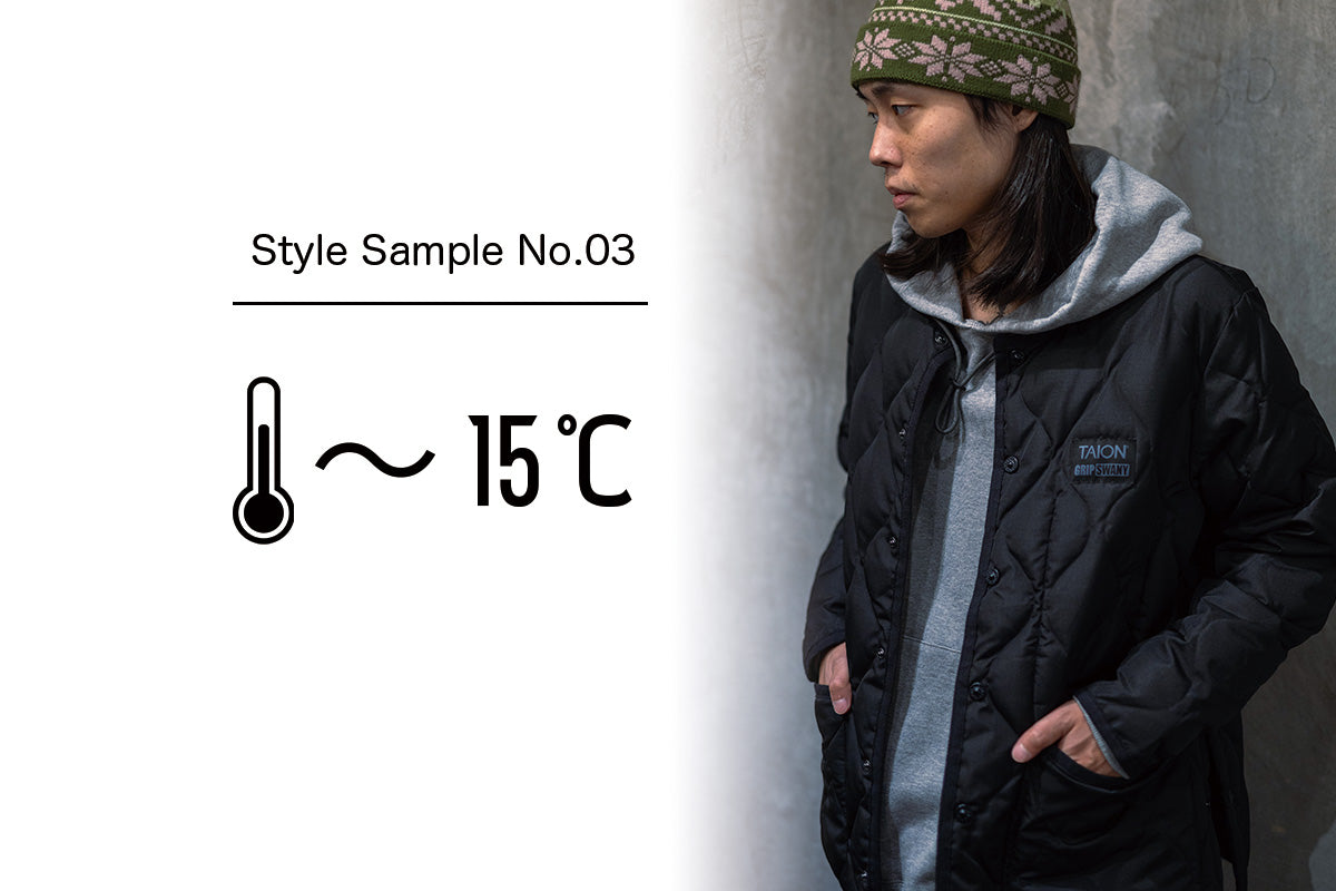 真冬の気温時にはやっぱりダウンジャケットが主役に。ロフト感のあるボリューミューなダウンジャケットをメインに据え、安定の暖かさを担保。インナーには、話題となっているタイオンとのコラボベストをチョイスし、さらなる暖かさをプラス。