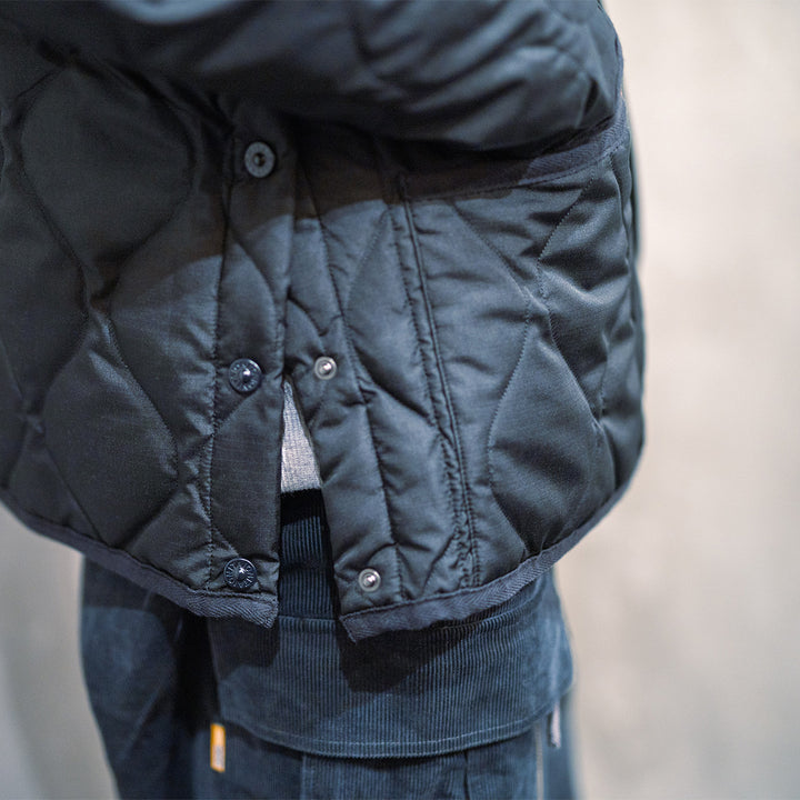 話題のタイオンコラボのダウンジャケットは、ロフト感を抑えた薄手の仕上がりながらも、800fpなので、しっかり暖かさも担保。ミリタリー調のジャケットにマッチするプルオーバーパーカとワイドシルエットなボトムスを合わせてストリートテイストに仕上げた。