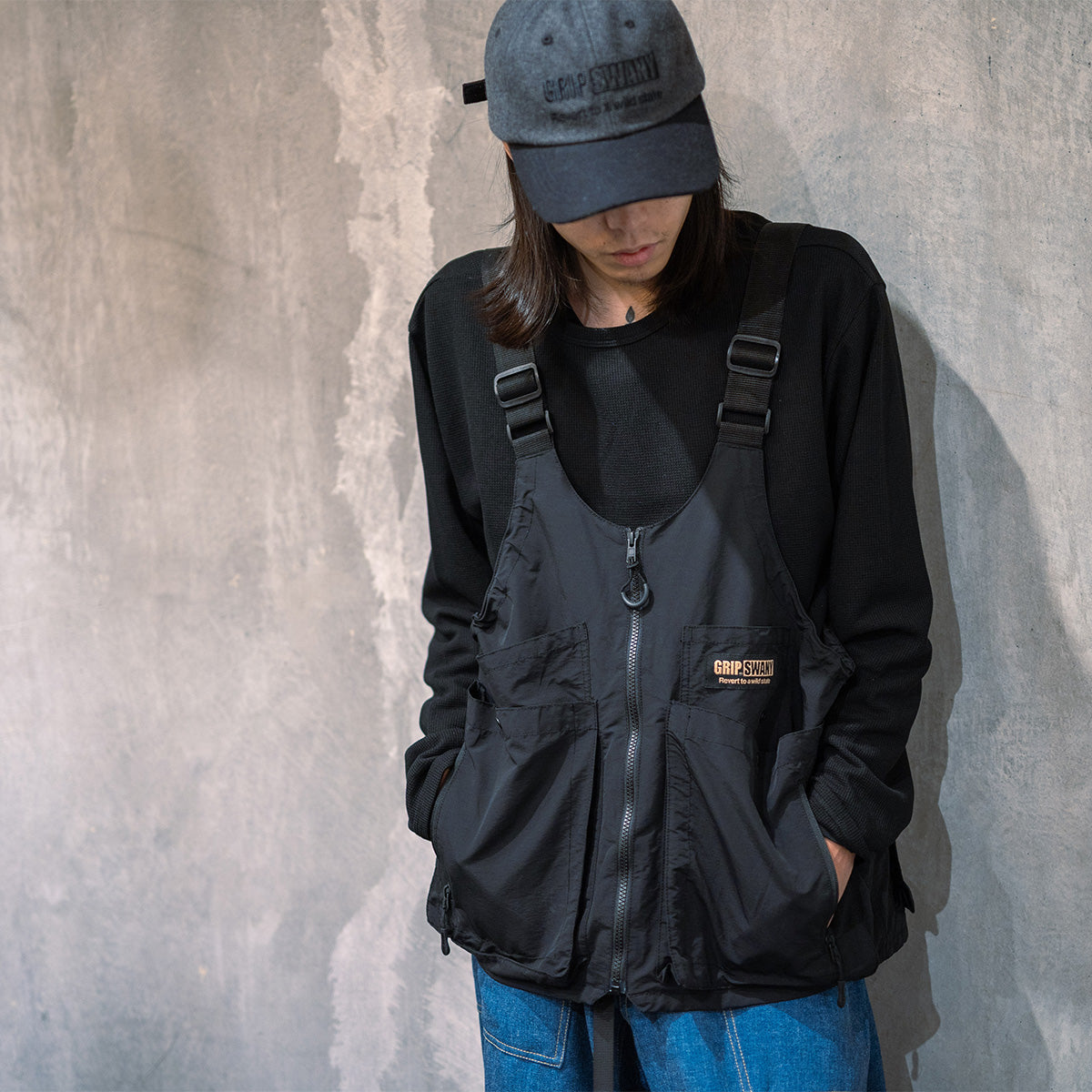 グリップスワニーらしい無骨感のあるミリタリージャケットとギアバッグベストをレイヤードし、ミリタリー&アウトドアなミックススタイルを確立。テーポードの効いたデニム調パンツも軽やかな春スタイルを後押し。