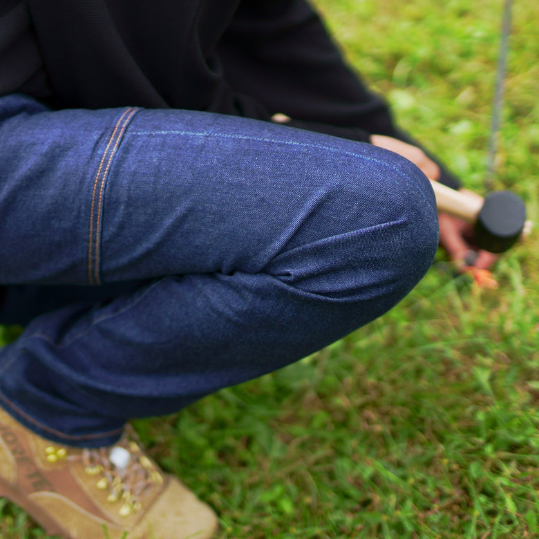 コチラのアイテムで特にお勧めしたいのがアウトドアでの使用。外遊びに汚れはつきものだが、このアイテムなら炭や泥の汚れが勲章になること間違いナシ。デニム生地だからガシガシ洗ってエイジングを楽しめ、気がつけばソト遊びの相棒に!