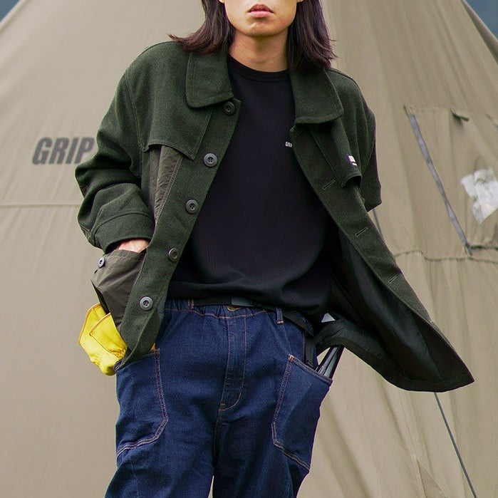 「ウールライクな生地を使った【GSMJ-058】 MACKINAW JACKETを合わせオーセンティックなアウトドアスタイルにまとめてみました。ポケットは大容量でグローブなどのギアだけでなく、ペグや火おこし用の木の枝などをちょっと入れておきたいなんてシーンで便利。サイズは一般的なLサイズですが腰回りがゆったりとしていてかなりリラックス感があります。」