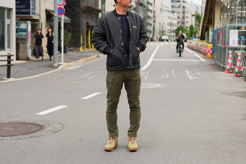 「ブラックの【GSMJ-054】 WATER REPELLENT QUILTING BLOUSONをサッと羽織って都会的コーデに仕上げました。僕は比較的足が太めなのでLサイズだとスリムシルエットのようになってしまいますが、ストレッチ感があるのでバイクをまたがる時も問題ありませんでした。大きなポケットはコンビニで買い物をする時に重宝しており手放せません。」